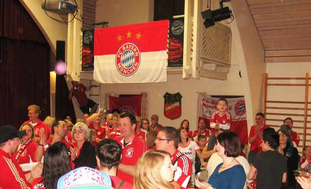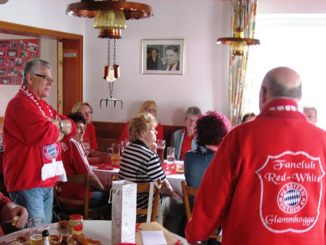 Fleissige Helfer des Fanclubs " Red-White Glammhogga " aus Gablingen standen schon um 9:00 Uhr auf der Matte, um den Saal des Theaterheims in Lützelburg für die Tombola am Abend in ein rot-weisses Meer von Fahnen, Transparenten, Meisterschalen, Tischgestecken ect. zu verwandeln. Stolz prangte die clubeigene Fahne vor dem Bühnenvorhang, während den Präsidiumstisch das Emblem des Fanclus zierte. Die offizielle Feier begann erst, als die restlichen Bayern-Fans " siegestrunken " vom Derby aus...