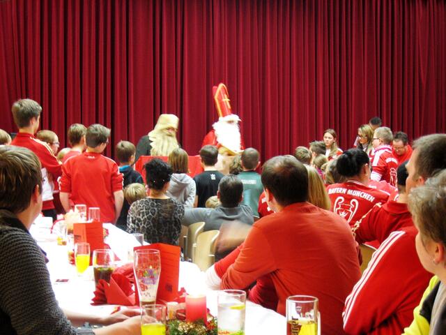 Am Nikolaus-Tag besuchte ein österreichisch-bayerisch sprechender Nikolaus die traditionelle Feier des Bayern-Fanclubs Glammhogga aus Gablingen im Theaterheim zu Lützelburg. Mit flotten, gut gereimten Sprüchen brachte der Nikolaus zusammen mit seinem Knecht Rupprecht die Feier fast zum " toben ". Woher er wohl die vielen " treffenden " Details über so manche Mitglieder vom vergangenen Jahr wußte - Präsident Rudi Tausend mit seinem Stellvertreter Manuel Tausend, schmunzelt nur hintergründig...