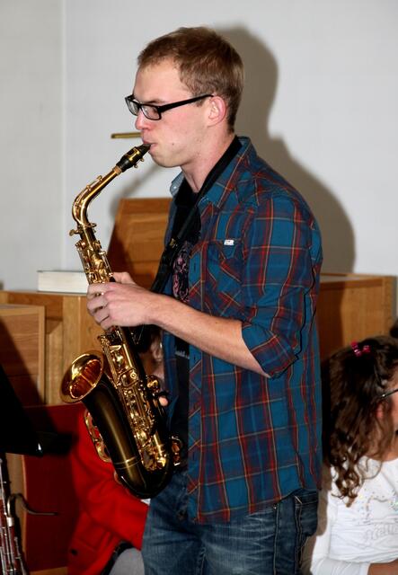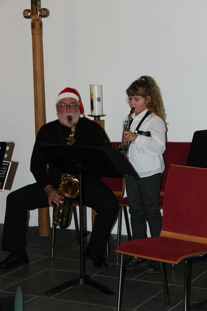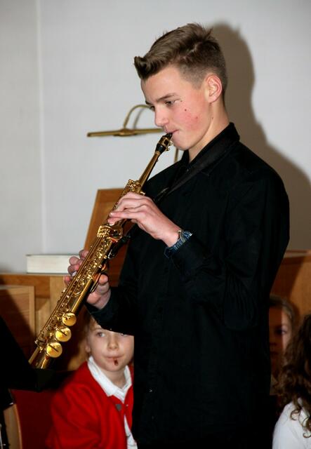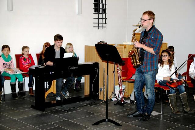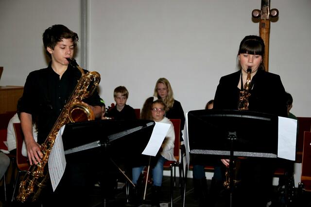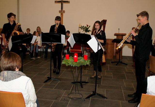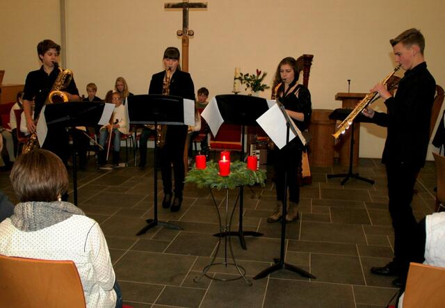 Auftakt und Finale beim Adventskonzert der Musikschule Wertingen  gestalteten die Saxofonisten aus der Klasse von Musikdirektor Manfred-Andreas Lipp mit den Weihnachtlichen Hits „Winter Wonderland“, Sleigh Ride“, „Feliz Navidad“, „Rudolph, the Red-Nosed Reindeer“ und „White Christmas“ mit Dominik Kögl am Drum-Set, sowie v l n r: Luis Haupt, Viktoria Krebs, Martin Stempfle, Katja Fechtner und Manfred-Andreas Lipp.