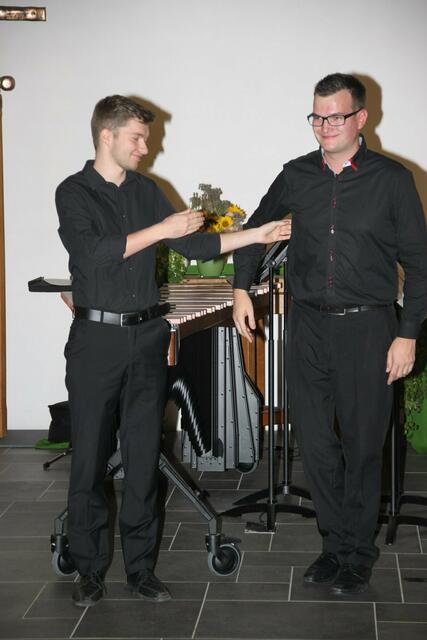 Zum Abschluss des sehr gelungen Konzertes unter dem Motto „Drum ’n’ Bass“ stellten sich v. l. Fabian Heichele, Karolina Wörle, Michael Ahne, Felix Birnbaum und Musikdirektor Manfred-Andreas Lipp zum Erinnerungsfoto.