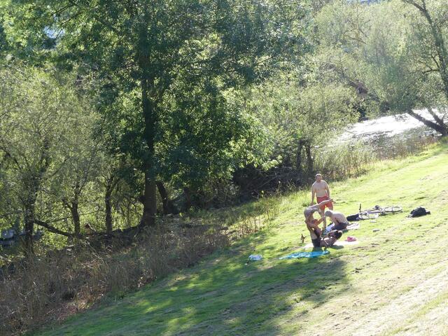Es geht an die Lenne in Hohenlimburg. Nicht ein Nutria zu sehen von den 7 vom letzten Jahr. Weggezogen oder abgeschossen? Auf der Wiese liegen jede Menge Federn. Wie damals bei Schloss Benrath. Einige Kajakfahrer gehen ihrem schönen Sport nach. Von der Lennebrücke mache ich noch Fotos stromaufwärts. Ein Reiher breitet seine Flügel aus und trocknet sie in der Sonne. Da schwimmt ein einzelnes Nutria. Ein Albino? Unter der Brücke verschwindet er. Noch ein bisschen Sonne tanken im Lennepark mit...