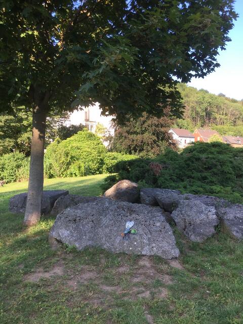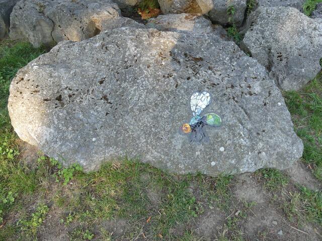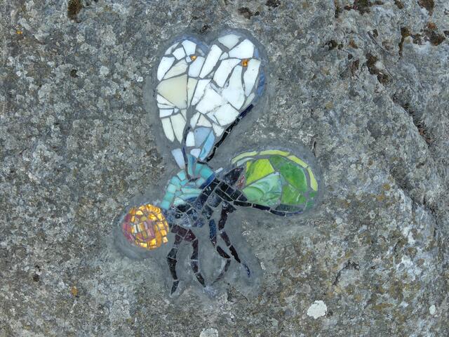 Neu im Lennepark Auf ein Stündchen in den Lennepark. Ich genieße die wärmenden Strahlen der Abendsonne. Auf dem großen Felsbrocken vor dem Wasserspiel gibt es was Neues. Ein Mosaikinsekt, schön gemacht. Die Kaninchen springen übermütig über die Wiese, solange kein Hund in der Nähe ist. Treffe noch Bekannte und wir klönen über dies und das. Als die Sonne versinkt, wird es kühler. Ab nach Hause.