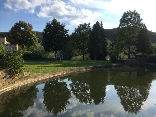 Lennepark – Oase in Hohenlimburg Der Blick über die Lenne, am Rathaus vorbei, aufs Hohenlimburger Schloss. Bin gespannt, was in dem kleinen Gärtchen im Park wieder schönes angepflanzt wird. Die bunte Steinreihe, Lenne oder Holibusteine wird immer länger. Blick auf Bilstein. Altes Traditionsunternehmen in Holibu. Eine dicke Hummel verschwindet in einem Erdloch. Ein junger Mann entsorgt seinen ausgedrückten Zigarettenstummel im Papierkorb. Die Boule-Spieler sind noch nicht da. Schön ist es hier.