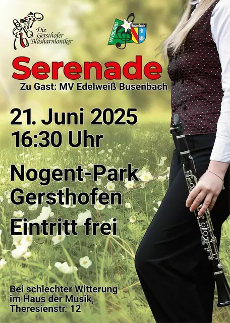 Am Samstag, den 21. Juni 2025 um 16:30 Uhr, laden die Gersthofer Blasharmoniker wieder zur traditionellen Serenade in den Nogent-Park ein! Dieses Jahr kommen die Musikerinnen und Musiker vom Musikverein Edelweiß Busenbach (Region Karlsruhe) auf einen Kurzbesuch nach Gersthofen, nachdem die Blasharmoniker dort 2024 ein paar schöne Tage verbracht haben. Beide Orchester haben ein buntes Programm ausgesucht, das perfekt zu einem sommerlichen Nachmittag im lauschigen Park passt. Der Eintritt ist...
