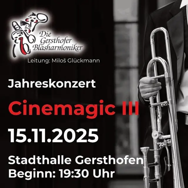 Die Gersthofer Blasharmoniker laden am Samstag, den 15. November 2025, um 19:30 Uhr zum Jahreskonzert in die Stadthalle Gersthofen ein. Unter dem Motto „CINEMAGIC III“ erwartet das Publikum ein mitreißender Abend voller bekannter Filmmusik – unter anderem mit Stücken aus The Rock, Batman, Mission Impossible, Lawrence of Arabia sowie einem Medley mit den größten Melodien von Ennio Morricone. Eintritt: 15 Euro, Jugendliche bis 14 Jahre 1 Euro. 1 Euro pro Karte geht als Spende an den Gersthofer...