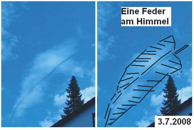/ Gedicht Als ich nach Hause fuhr, entdeckte ich diese Feder Wolke. Schnell nach Hause, den Fotoapparat geholt und dieses TOLLE WOLKENSPIEL eingefangen links das Original und rechts - meine Feder - die ich darin sah Wolkenspiel mit Feder copy@Obermaier Brigitte, 07.07.2011 Ich sehr zum Himmel hinauf. Zarte Wolken wandern dort hinweg. Welch Faszination tut sich auf. Es ist der schönste Himmelsweg. Meine Feder öffnet mein Herz. Lass den Frieden herein. Verbanne den Schmerz. Bin doch nicht allein....