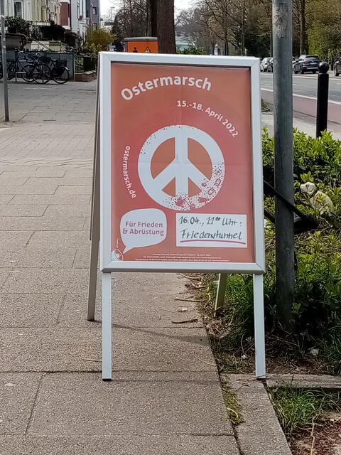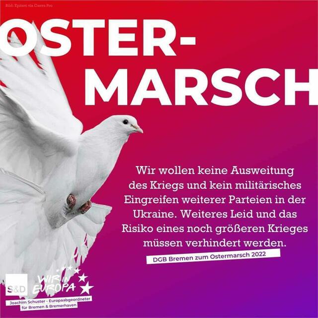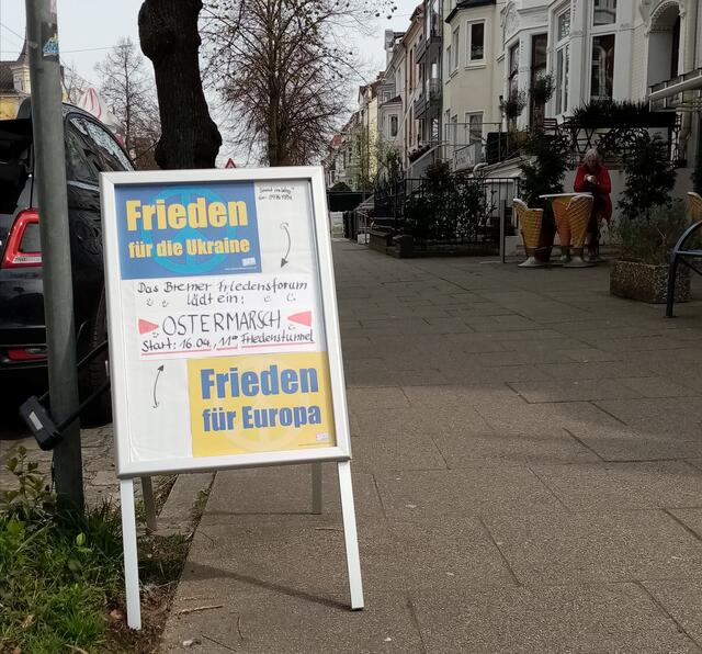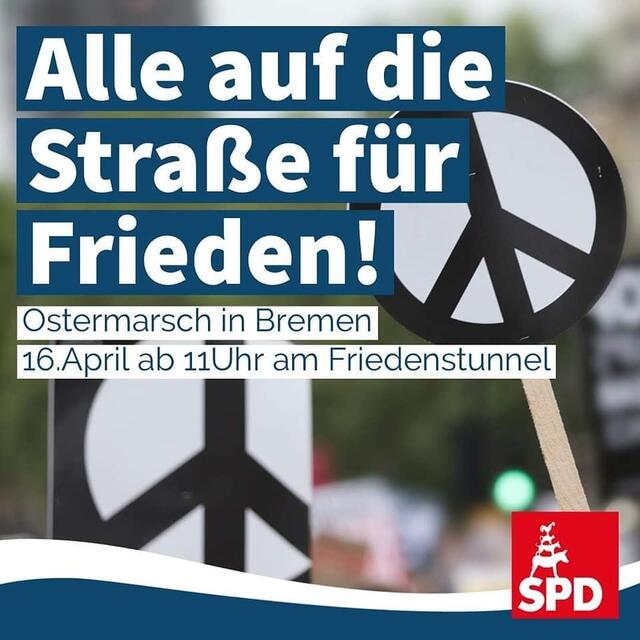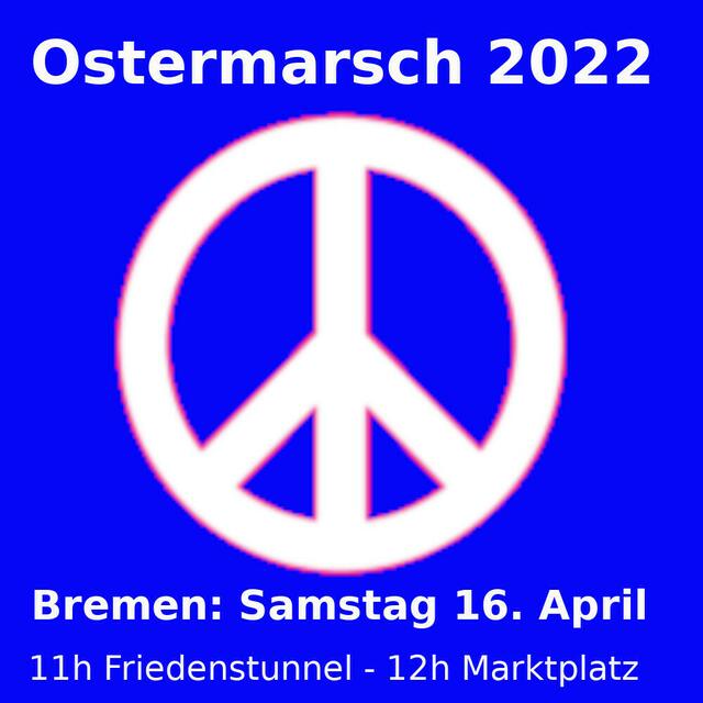 Bremen. Unter dem Motto "Krieg und Rüstung lösen keine Probleme!" ruft das Bremer Friedensforum zum diesjährigen Ostermarsch in der Hansestadt auf. Treffen ist am Ostersamstag, 16. April, um 11 Uhr mit einer Auftaktkundgebung um 11 Uhr am Friedenstunnel (Parkallee/Hohenlohestraße). Die Begrüßung erfolgt durch Eva Böller (Bremer Friedensforum) und Regina Heygster (Friedenstunnel Bremen). Die Demonstration durch die Innenstadt erfolgt durch den Friedenstunnel – An der Weide – Herdentorsteinweg –...
