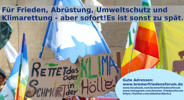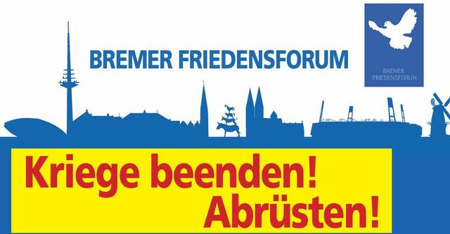 Für Frieden, Solidarität und Gerechtigkeit! Für eine Welt ohne Unterdrückung, Gewalt und Krieg! Abrüstung statt Aufrüstung, für Investitionen in Ökologie und Soziales! Atomwaffen raus aus Deutschland! Atomwaffenverbotsvertrag unterzeichnen! Stoppt den Waffenhandel! Das Bremer Friedensforum ruft mit weiteren Organisationen für Freitag, 1. September, um 16 Uhr auf dem Marktplatz zu einer Kundgebung zum Antikriegstag auf. Es sprechen: Amira Mohamed Ali, Fraktionsvorsitzende Die Linke im Deutschen...