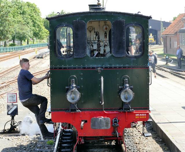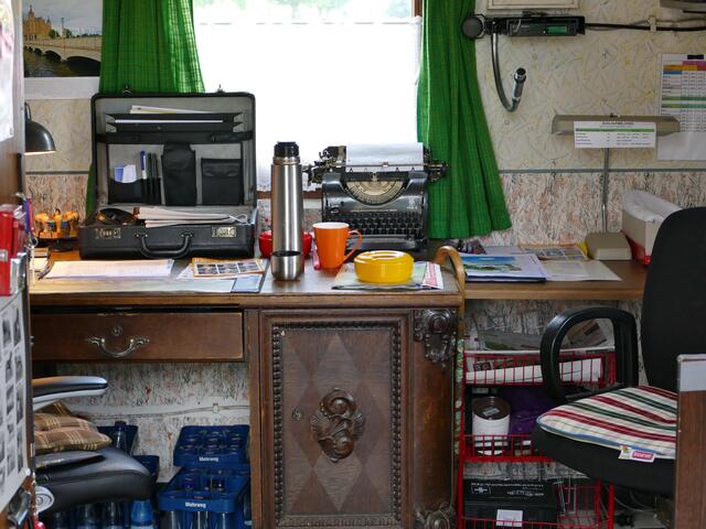 Lieber Leser, diese historische Bahnfahrt steht jetzt kurz vor dem 50. Jubiläum und das ist für mich ein Grund zur Testfahrt. Das Wetter ist auch ganz prima, daher starte ich von Asendorf nach Bruchhausen-Vilsen mit einer alten, schwarzen Dampflok und einigen Waggons. Das Abenteuer beginnt schon am Startpunkt, wo ich einen Blick beim Kauf in das Fahrkartenhäuschen machen durfte. Der Stationsvorsteher hatte es sich gemütlich gemacht, eine "olle" Schreibmaschiene war zu sehen und das Telefon...