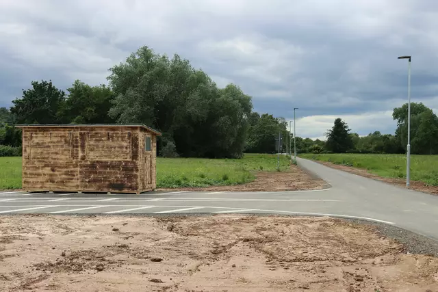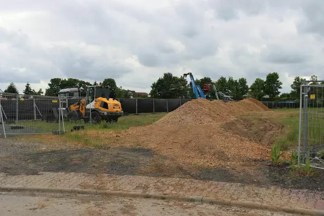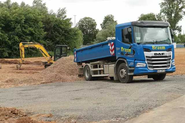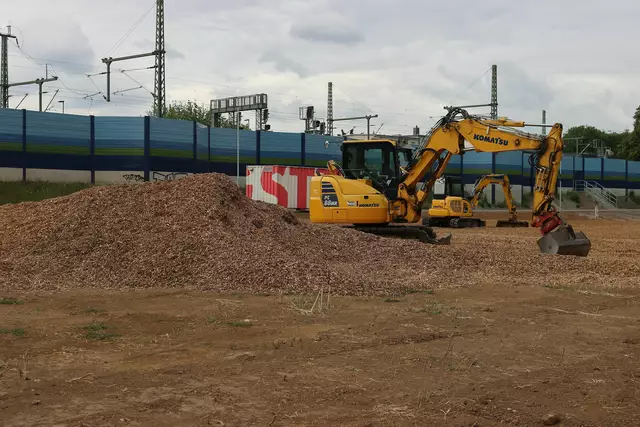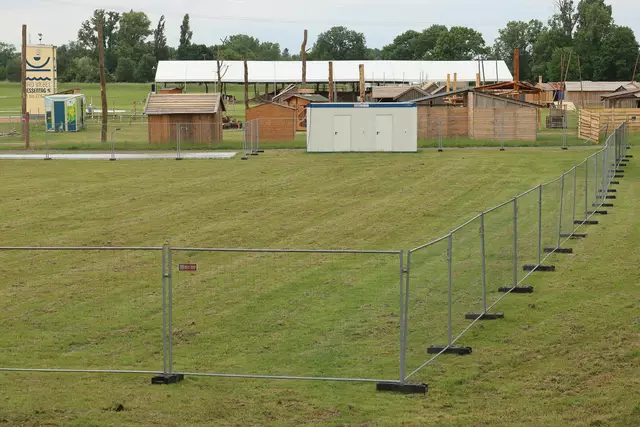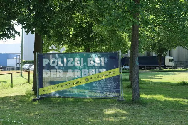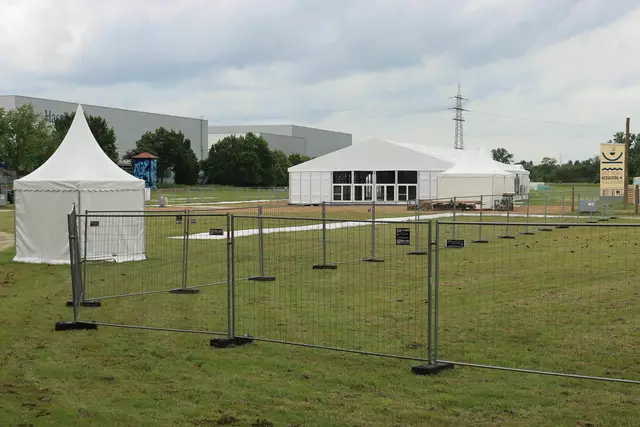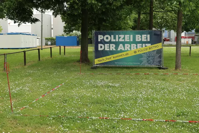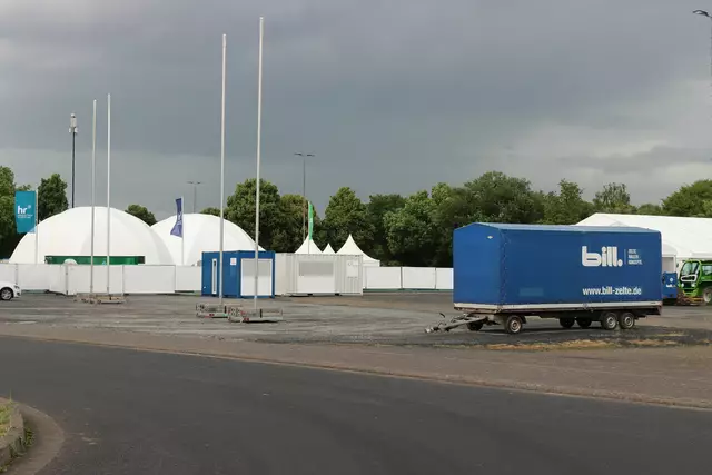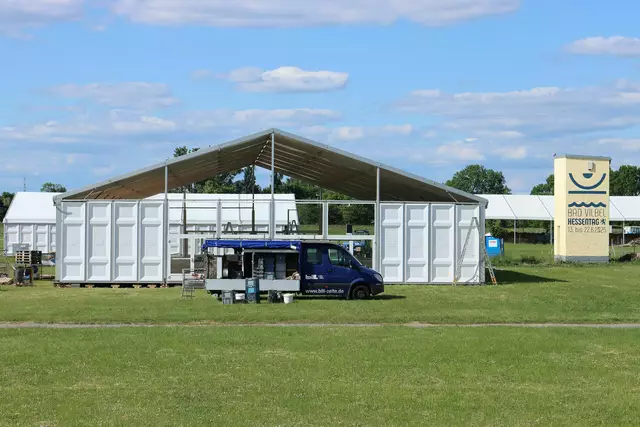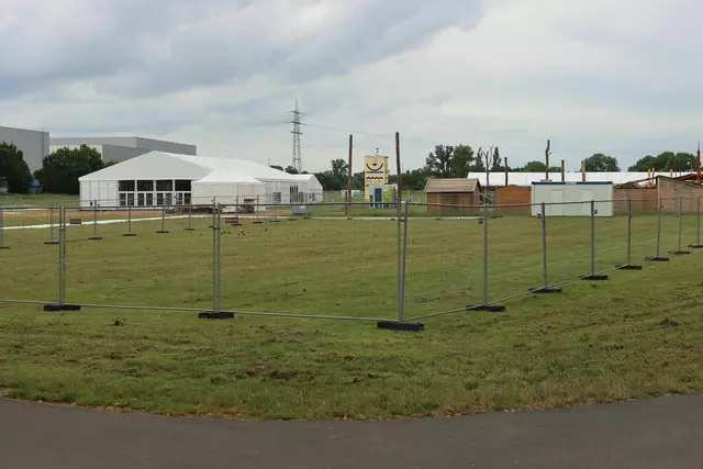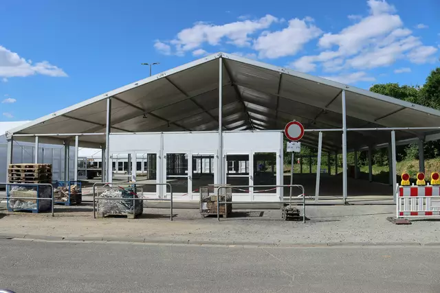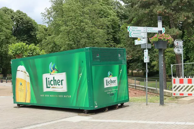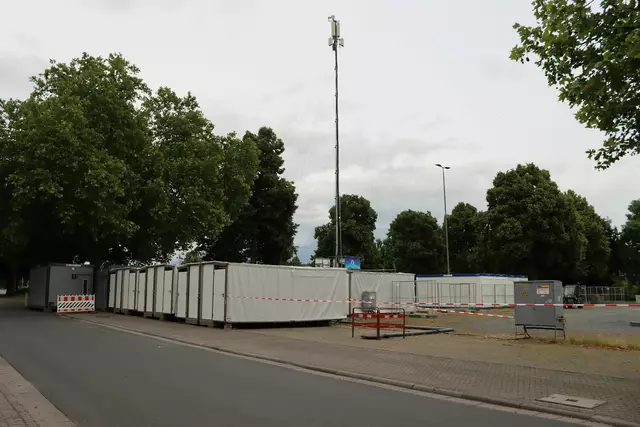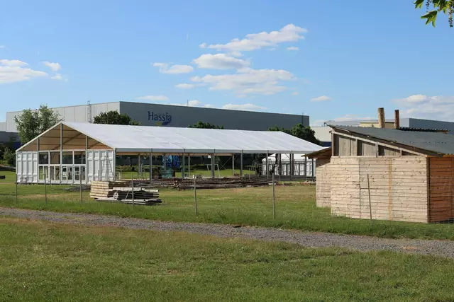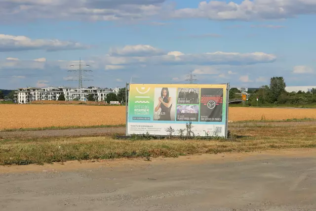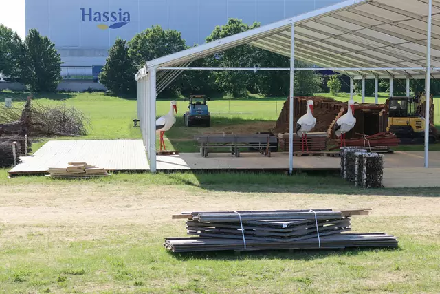 Die Werbung vor einem ehemaligen Gebäude des DAG-Sprengstoffwerks zeigt: Der Hessentag ist nah.