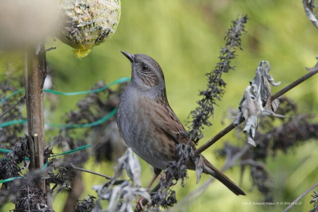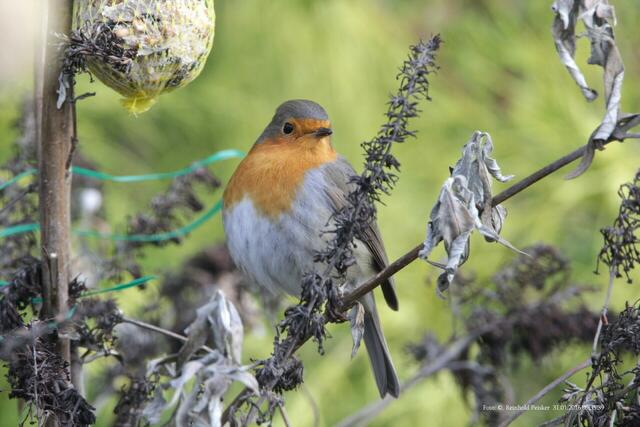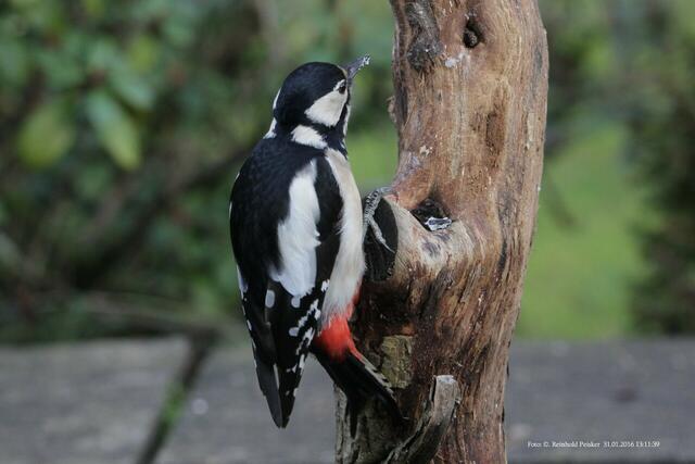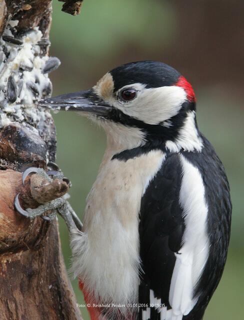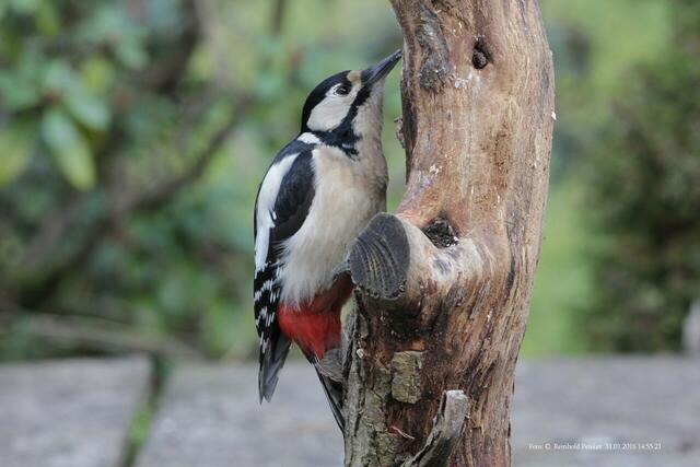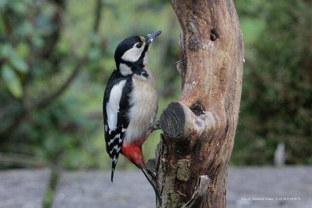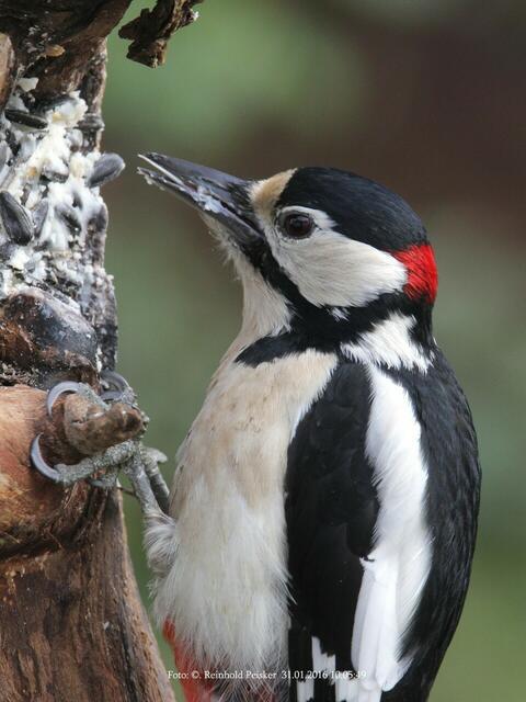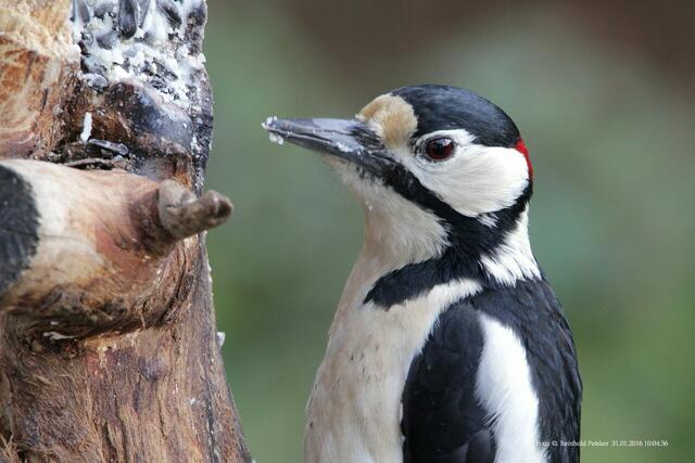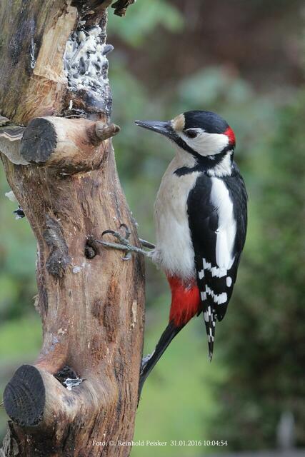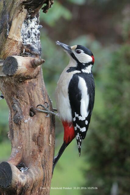 Hier auch mit einer Rätselfrage (s. u.)! Seit sieben Jahren kann der Fotograf im Winter ein Buntspechtpaar beobachten. Große Futterstangen, die etwa zwei Meter über dem Boden hängen, sind beliebte Landeplätze für sie. Nach längerer Pause kam jetzt wieder einmal das Buntspechtweibchen zum Fressen. Als es den Fotografen am Fenster entdeckte, flog Madam schnell über den Rasen hinweg zum nächststehenden Baum um dann gemütlich und auf den Stamm trommelnd langsam nach oben zu klettern. Dann machte...