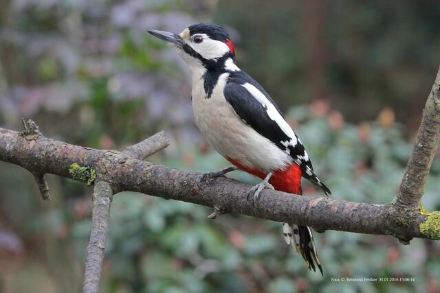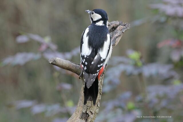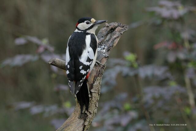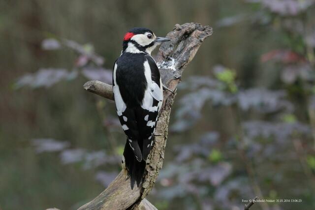 Bei dem heutigen Sauwetter (Nebel, Eisregen, Schneefall) hatte sich doch tatsächlich ein Buntspecht bemerkbar gemacht. Leider war er sehr weit oben im Baum, aber das Gehämmer auf dem gefrorenem Holz war nicht zu überhören.