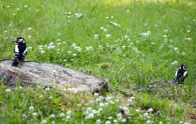 Heute konnte ich ein Buntspechtpärchen bei der Fütterung seines Nachwuchses beobachten. Aber nur ein einziges Mal waren beide Altvögel zur gleichen Zeit am Nest. Die Aufnahmen entstanden in der Nähe des Huthauses in Frohnau in einem Waldstück.