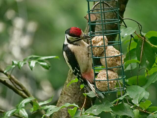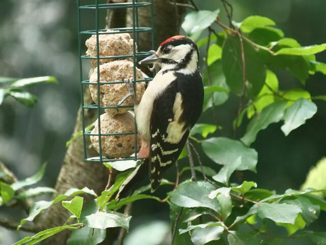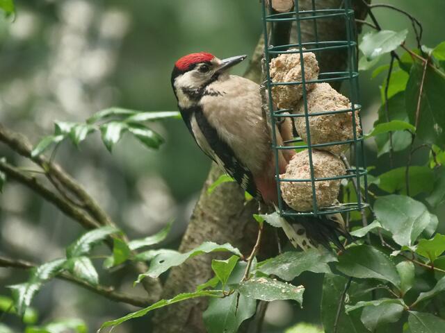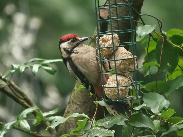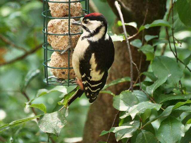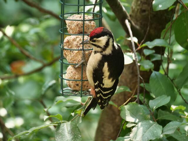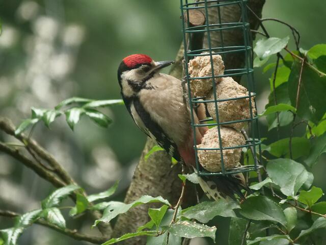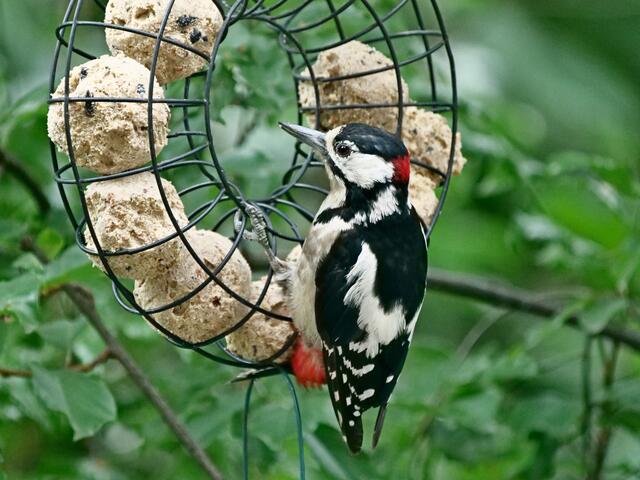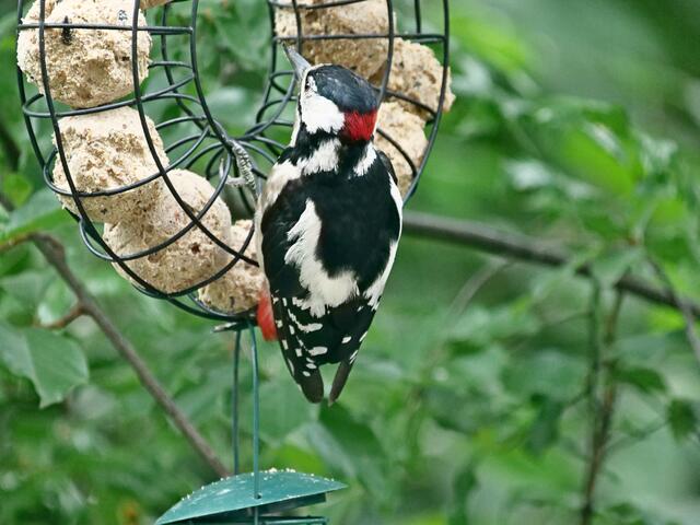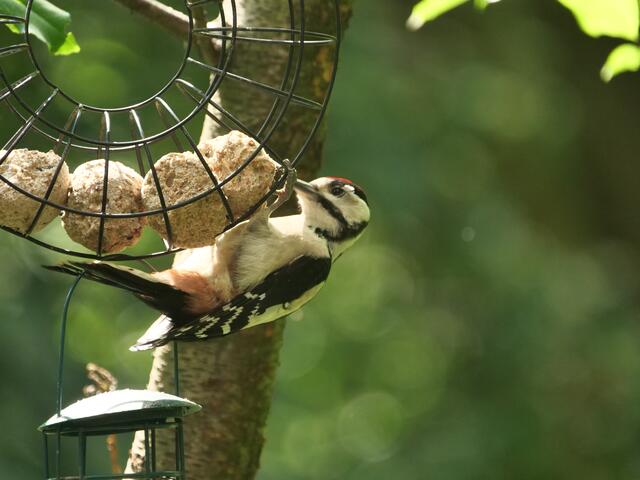 Madam Buntspecht pickt sich gerade besonders häufig Samenkörner aus der fetthaltigen Futterstange!