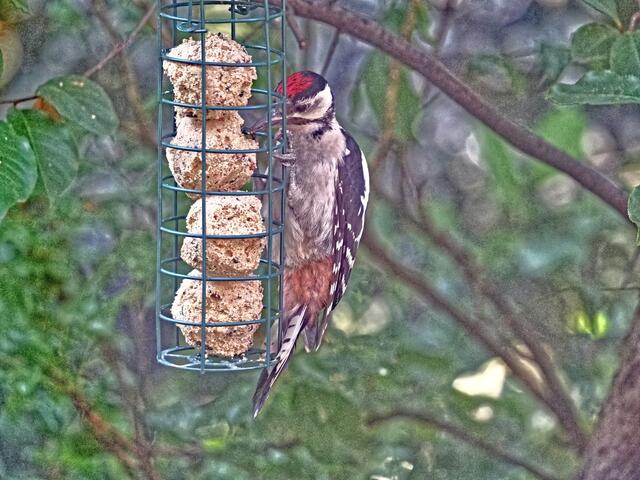 Da will man eigentlich nur in aller Ruhe Hans-Herberts Futterplatz sauber machen und plötzlich ist man behämmert ....... ähm ........ neee, plötzlich HÖRT man's hämmern! Man schaut, sieht am Insektenhotel cirka 12 Meter entfernt  'nen roten Hintern, man hält den Atem an und schleicht geduckt zurück ins Haus, um die Kamera zu holen! NATÜRLICH ist Mister Buntspecht dann schon weiter geflogen! Glücklicherweise aber nur bis in Nachbars Garten! Leider noch ein bißchen weiter weg.  ( Hihi, ihr kennt...