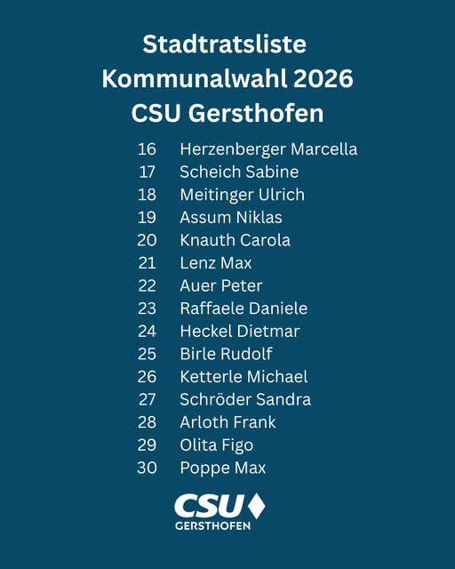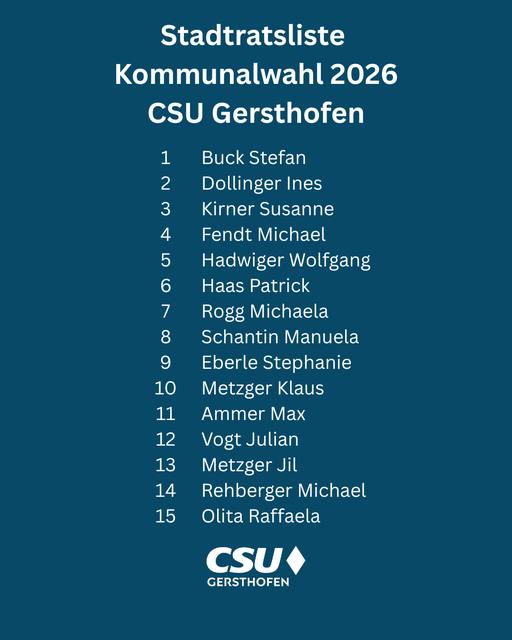 CSU eröffnet die Kommunalwahl mit Aufstellung für die Stadtratswahl: Teamgeist für Gersthofen Gersthofen. Im Wirtshaus Zum Strasser eröffnete Ortsvorsitzende Ines Dollinger die Aufstellungsversammlung der CSU Gersthofen. Sie begrüßte die zahlreich erschienenen Mitglieder des Ortsverbandes und stimmte sie auf die kommenden Monate des Kommunalwahlkampfs ein: „Die Stadtratsliste für die Kommunalwahl 2026 setzt sich zusammen aus erfahrenen Stadträtinnen und Stadträten, aber auch aus neuen...