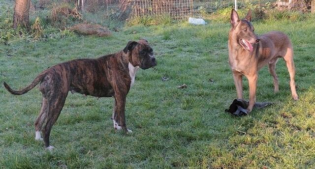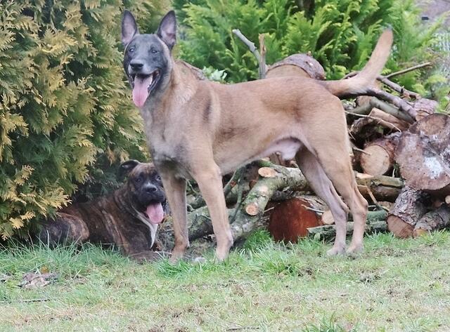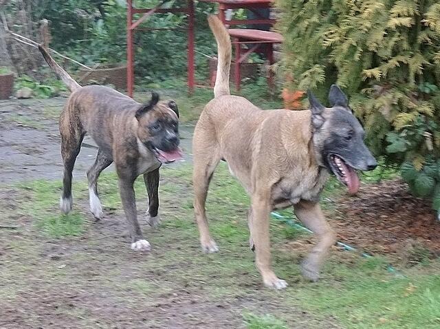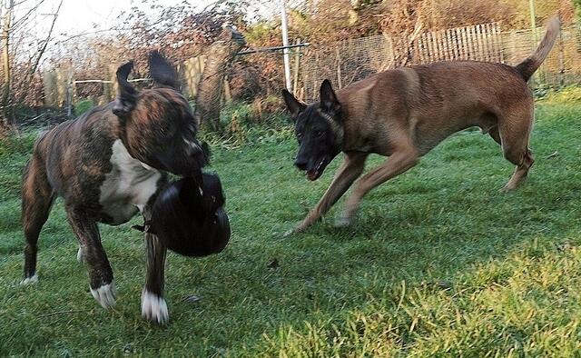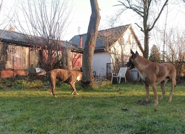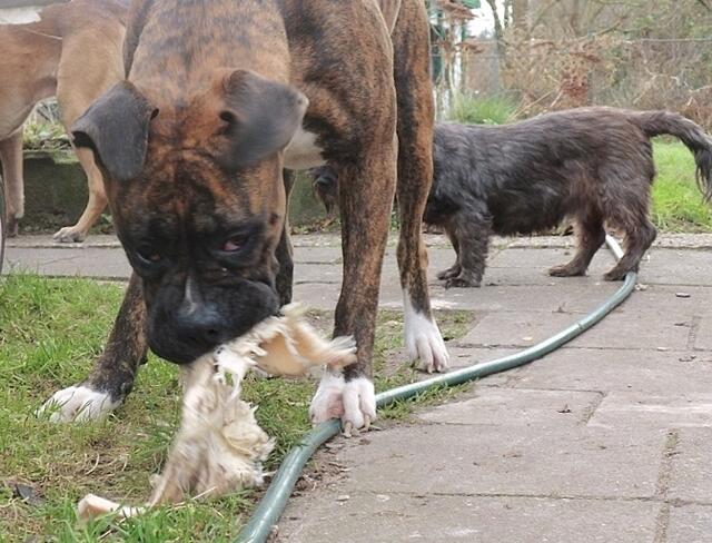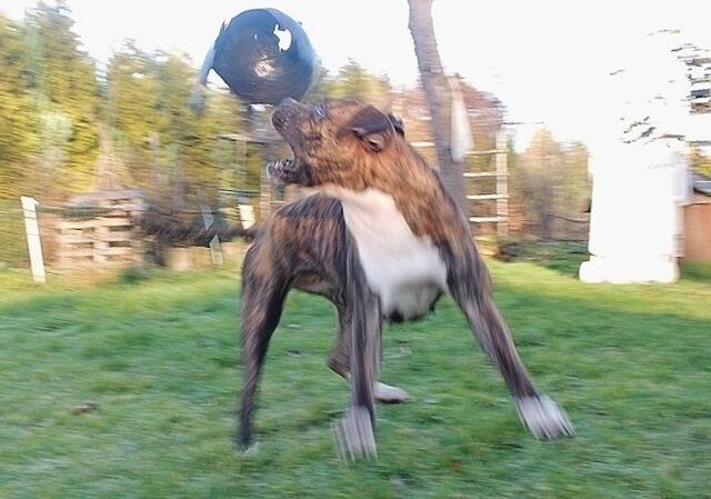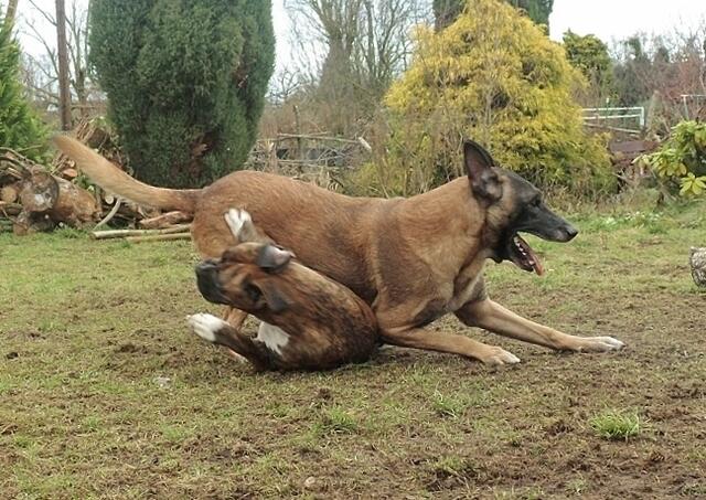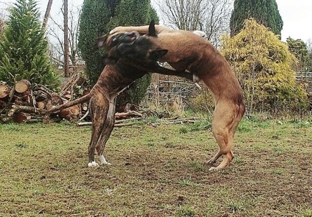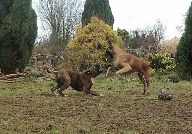 So geht es zu,wenn Barry und Boxy toben....Hunde spielen eben etwas unsanft ;-) Unschwer zu sehen,warum Jaccy die beiden meidet,wenn die loslegen - auch ich muss aufpassen das ich im Eifer der Hunde nicht umgerannt werde- gut das wir denen im Garten Platz zum ungestörten rennen,spielen und sonstigem bieten können. Auch zu sehen : Wo die sind,da wächst kein Gras mehr ! ;-)))
