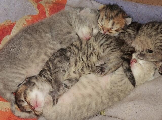 Im frischen Tüchern - Cleo und ihre 4 Kitten.