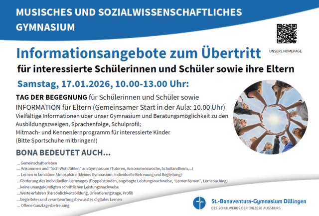 Am Musischen und Sozialwissenschaftlichen Gymnasium St.-Bonaventura steht der einzelne Mensch im Mittelpunkt: Kinder sollen hier nicht nur lernen, sondern sich wirklich wohlfühlen. Deshalb laden wir alle interessierten Schülerinnen und Schüler sowie ihre Eltern herzlich zum „Tag der Begegnung“ am Samstag, dem 17.01.2026, von 10.00 bis 13.00 Uhr ein. Der gemeinsame Start findet um 10.00 Uhr in der Aula statt. An diesem Vormittag erhalten Sie vielfältige Informationen über das Gymnasium, die...