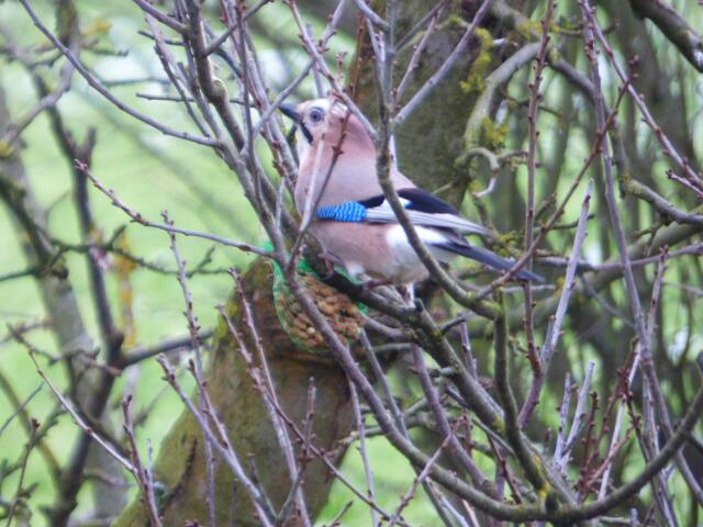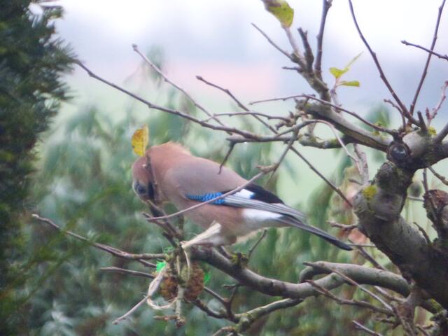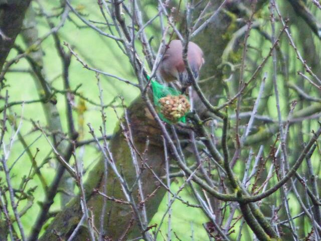 Heute waren gleich ZWEI Eichelhäher bei uns zu Gast, einer im Kirsch- und der andere im Apfelbaum! Und mittlerweile haben sie auch den Trick raus, an leckere Nüsse zu kommen, OHNE sich in das doofe kleine Futterhäuschen quetschen zu müssen! Zuerst wird mit dem Schnabel ordentlich in die Nussbeutel gehackt und wenn man Glück hat, kann man den Beutel dann etwas mit hochziehen! Dann die Kralle in den Beutel und festhalten und los geht's mit der Futterei! Die Bilder sind durch die Fensterscheibe...