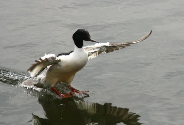 Mit ihrem, mit kleine Lammellen versehenen, Schnabel können sie hervorragend ihre Beute festhalten. Der Schnabel erinnert an eine Säge, daher auch der Name. Wie die anderen Fischfresser wie: Eisvogel, Graureiher, Kormoran und Haubentaucher ist der Gänsesäger von Fischern und Anglern nicht gern gesehen. Hier konnte ich in München einige Bilder von der Entenvogel bei der Landung machen.