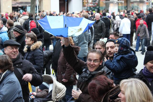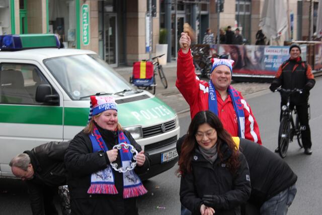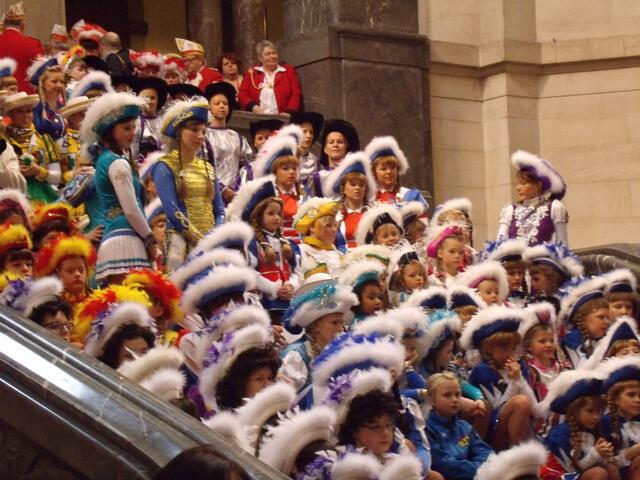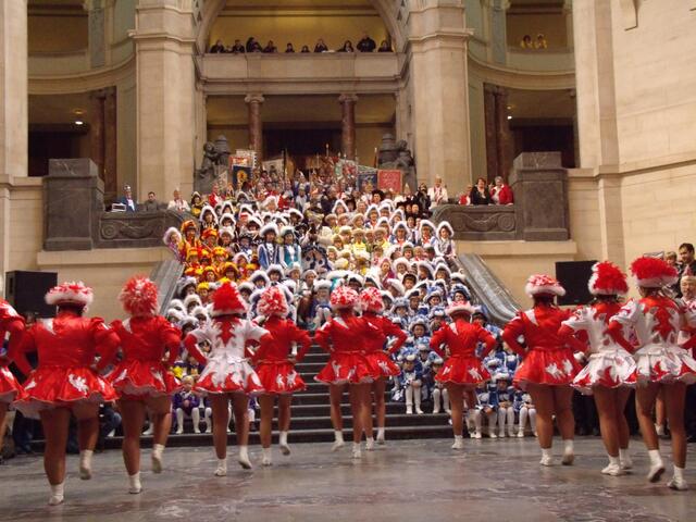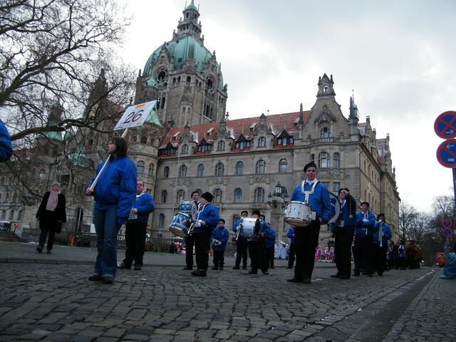 Ab 13.30 Uhr wurde das Neue Rathaus in Hannover zur Wartehalle für alle Musiker, Narren und Karnevalisten. Bis zur Marschaufstellung und zum Umzug um 15.11 Uhr war noch viel Zeit. Jeder nutzte die Zeit auf seine Weise. Hier wurde das Näschen gepudert, da noch einmal der Tanzschritt eines Funkenmariechens geprobt und dort noch ein Schluck aus der Flasche genommen. Trotz Minusgrade und Schneefall wurde auch vor dem Rathaus noch geübt, gesungen und "vorgeglüht". Die Stimmung war schon vor dem...