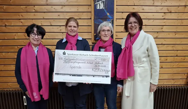 Das Vorstandsteam des Frauenbundes Aichach übergab der Einsatzleiterin des Familienpflegewerks Andrea Mayr eine Spende in Höhe von 550 Euro. Der Betrag kam aus Spenden der angebotenen Kräuterbuschen an Mariä Himmelfahrt zustande. Von links: Ingrid Hausmann, Andrea Mayr, Rita Widmann und Rosina Zwetschke. Das Familienpflegewerk ist auf Spenden angewiesen. Trotz öffentlicher und kirchlicher Zuschüsse und Förderung durch die Mitglieder des Katholischen Deutschen Frauenbundes, sowie ehrenamtlichen...