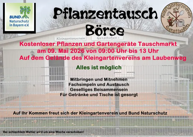 Der Kleingartenverein Gersthofen, der Umweltstammtisch und der Bund Naturschutz Gersthofen organisierten dieses Jahr wieder eine Pflanzentauschbörse in Gersthofen. Sie findet auf dem Gelände des Kleingartenvereins (Laubenweg) am 09. Mai 2026 von 09:00 Uhr bis 13:00 Uhr statt. Es sind alle Gersthofer Bürger die Pflanzen übrighaben, eingeladen zu kommen. Es werden Pflanzen getauscht, man kann mit anderem Gärtnern Fachsimpeln oder auch nur informieren. Der Kleingartenverein sorgte für Getränke und...
