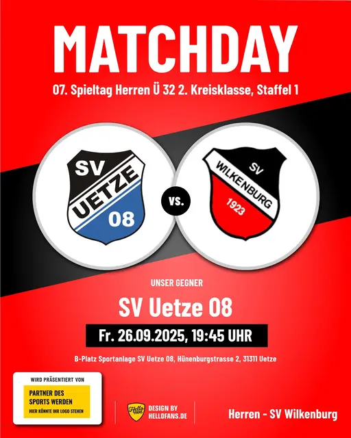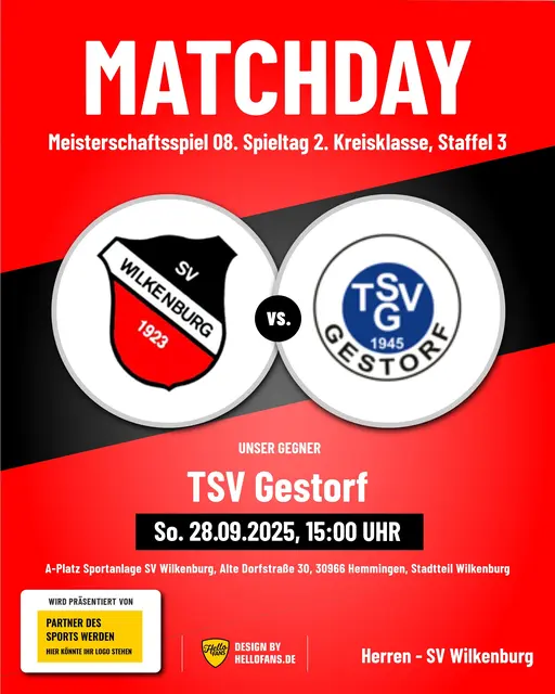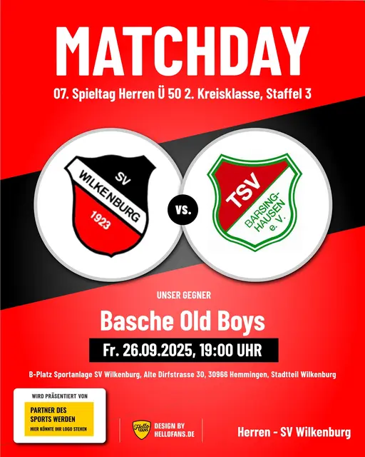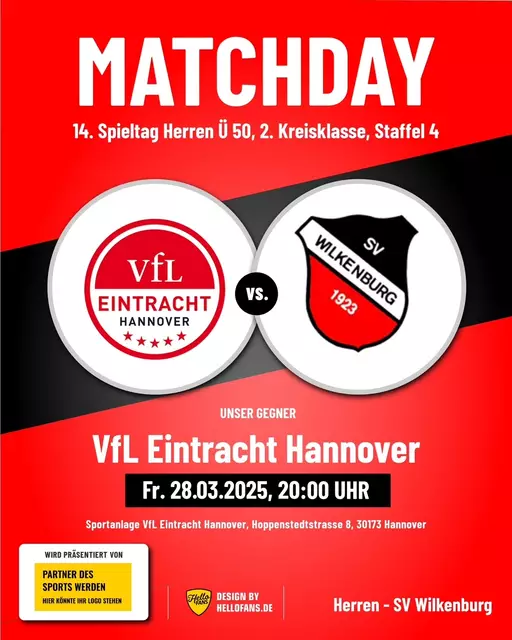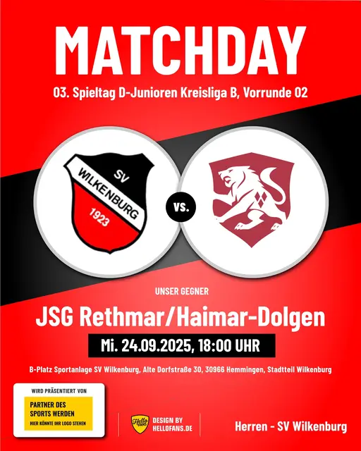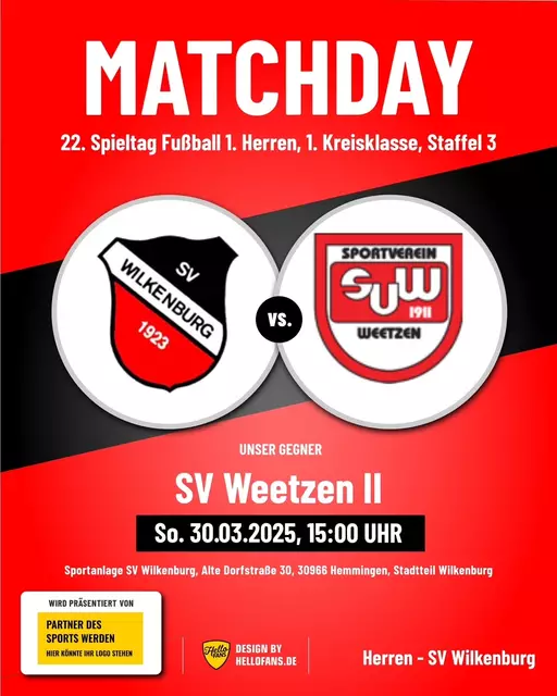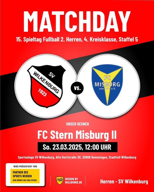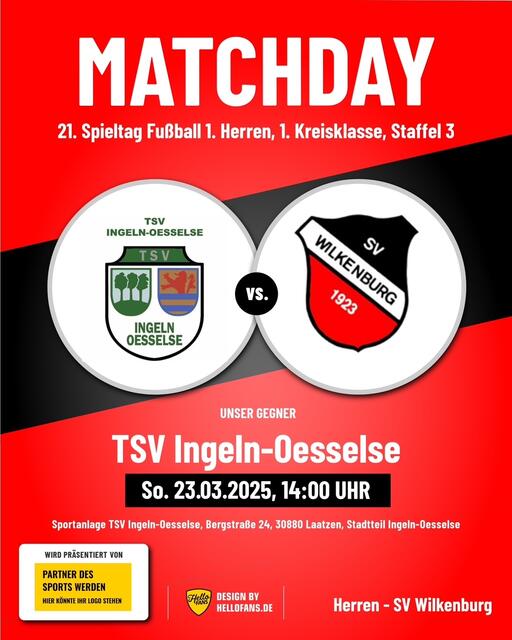 Bekanntlich sind die letzten beiden Heimspiele der 1. Herren des SV Wilkenburg gegen den BSV Hannovera Gleidingen II und gegen den FC Rethen in der 2. Kreisklasse, Staffel 3, aufgrund der schlechten Witterungsverhältnisse ausgefallen. Mittlerweile sind beide Partien - allerdings erst im kommenden Jahr 2026 - neu angesetzt worden. Das Spiel gegen den BSV Hannovera Gleidingen II soll nunmehr am Sonntag, 29.03.2026, um 14.00 Uhr, das Spiel gegen den FC Rethen am Ostersamstag, 04.04.2026, ebenfalls...