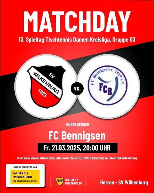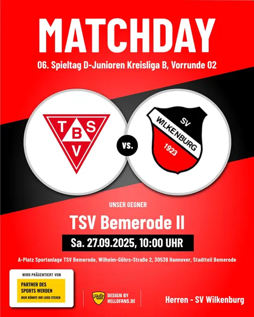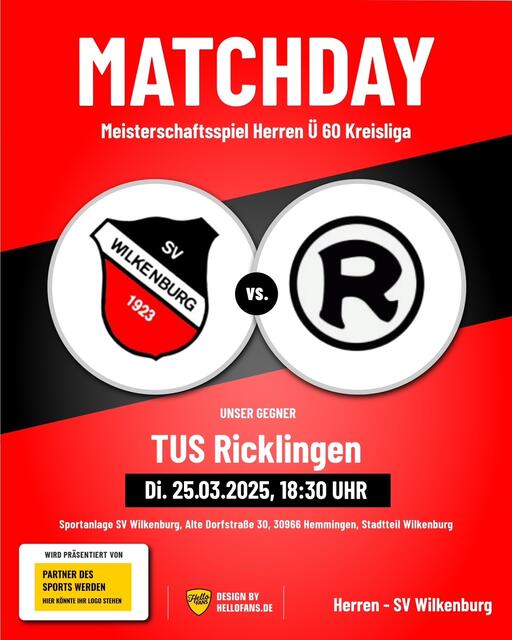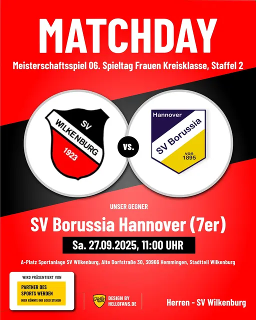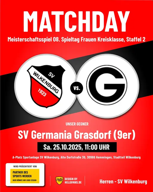 Fußball: Samstag, 25.10.2025, 11.00 Uhr Meisterschaftsspiel der Damen, 08. Spieltag SV Wilkenburg - SV Germania Grasdorf (Kreisklasse, Staffel 2) A-Platz Sportanlage SV Wilkenburg, Alte Dorfstraße 30, 30966 Hemmingen, Stadtteil Wilkenburg Samstag, 25.10.2025, 13.30 Uhr Meisterschaftsspiel der D-Junioren, 09. Spieltag SC Misburg United - SV Wilkenburg (Kreisliga B, Vorrunde 02) D-Platz Sportanlage SC Misburg United, Seckbruchstraße 20, 30629 Hannover, Stadtteil Misburg Tischtennis: Freitag,...