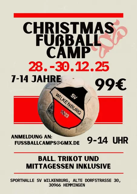 Drei Tage voller Action, Teamgeist und Spaß: Der SV Wilkenburg lädt von Sonntag, 28.Dezember, bis Dienstag, 30. Dezember 2025, zum diesjährigen Christmas-Fußballcamp in die Mehrzweckhalle des Vereins an der Alten Dorfstraße 30 ein. Teilnehmen können alle fußballbegeisterten Kinder im Alter von 7 bis 14 Jahren, ganz egal, ob Anfänger oder Vereinsspieler. An drei intensiven Trainingstagen erwartet die Kids ein abwechslungsreiches Programm: Technikübungen, spannende Spielformen, kleine Turniere...
