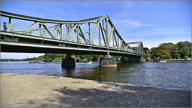 Die Glienicker Brücke wurde 1907 errichtet und war lange Zeit ein legendärer Schauplatz des Kalten Krieges. Über sie tauschten die USA und die Sowjetunion Spione aus. Heute ist die Brücke eine unspektakuläre Verbindung nach Potsdam, hat jedoch einen sehr schönen Blick über die zauberhafte Havellandschaft zu bieten. Quelle und weitere Informationen: http://www.berlin.de/orte/sehenswuerdigkeiten/glie... Informationen z.B. auf: http://www.glienicker-bruecke.de/1.html