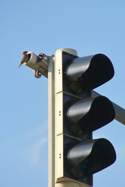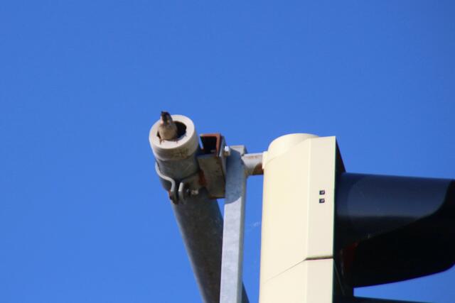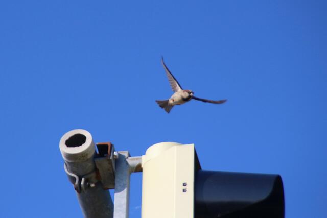 Dieser männliche Haussperling hatte eine prächtige Fasanenfeder gefunden. Lange versuchte er, diese in das Mauerloch zu bekommen, um sie zum Nestbau zu verwenden. Nach mehreren Pausen und Anläufen hatte er es dann endlich geschafft.