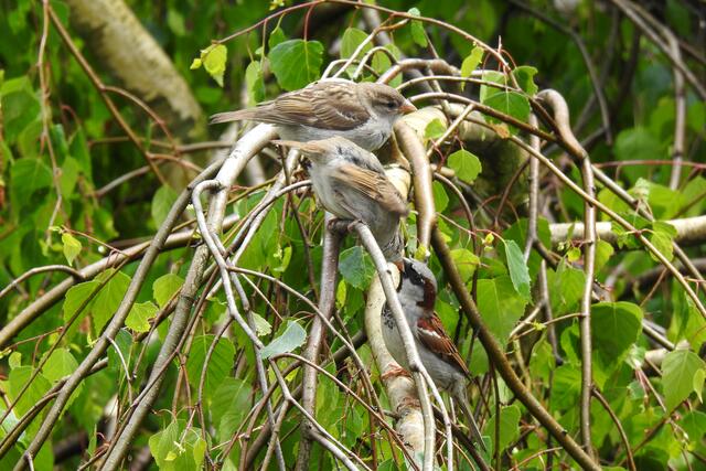 Vorgestern sind bei unserem Nachbarn die ersten Spatzenkinder ausgeflogen. Ziemlich früh im Jahr und ziemlich kaltes Wetter haben sich die drei Kleinen ausgesucht... Eben waren sie wieder mit Mama in unserem Garten unterwegs und ich konnte durchs Fenster ein paar Aufnahmen machen.