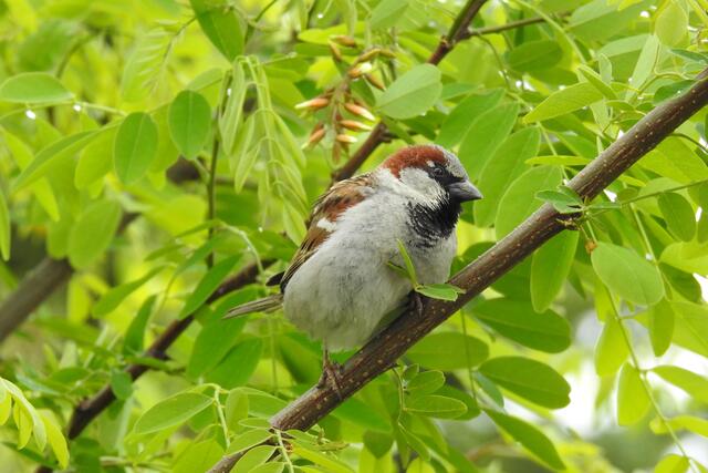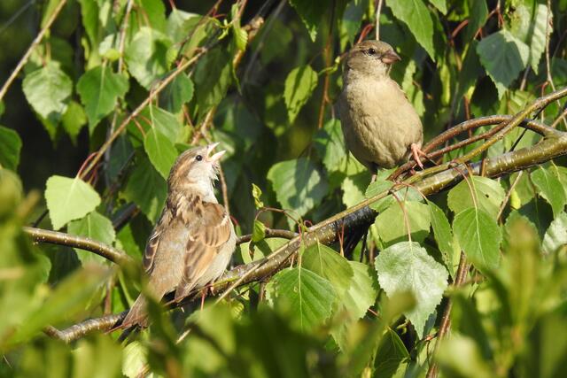 Mit den sinkenden Temperaturen kommen wieder Scharen von Spatzen in unseren Garten, um sich an den Futterstellen zu stärken. Ein wildes Getschilpe begleitet uns den ganzen Tag, denn die Sperlinge sammeln sich zwischendurch immer wieder in unserem Kugelahorn und lugen tschilpend vorwitzig zwischen den Blättern hervor. Das Sprichwort "Das pfeifen die Spatzen von den Dächern" bekommt da eine völlig neue Bedeutung. Bei genauerem Hinsehen erkennt man, dass es sich bei den Spatzen um Haussperlinge...