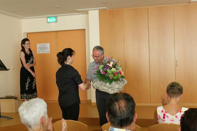 Mit einer Rose bedankte sich Heike Mayr Hof (3. von rechts) beim Klavierbegleiter Wolfgang Kraemer und ihren Schülern Mirjam Wiedemann, Lisa heim, Franziska Mayr, Tanja Gerblinger, Julian Beutmiller, Theresa Ackermann und Maria Dietrich (v. links).