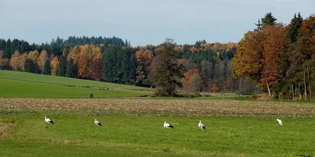 Es kam überall zu "Grüppchenbildung" an diesem sonnigen Feiertag und zwar bei den zahlreichen Spaziergängern und den ebenso zahlreichen Großvögeln. Die Wiesen zwischen Flußufer und Waldrand waren auf der einen Seite Treffpunkt von Wanderern, Radfahrern, Joggern und Hundegassi-Gehern und auf der anderen Seite von Störchen, Grau- und Silberreihern. Alle zusammen genossen die sonnengeflutete Atmosphäre dieses ersten Novembertags.