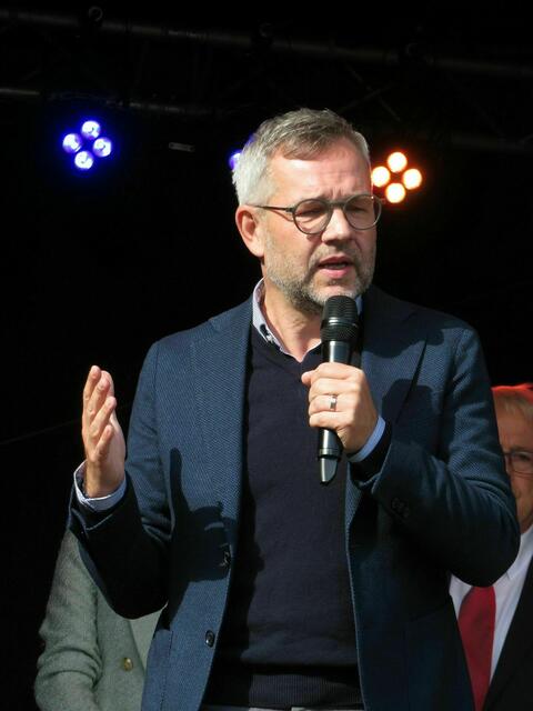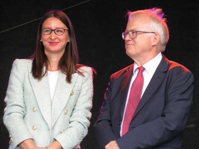 Während Bürgermeister Brum redet, grinst Bürgermeister Vollmer auf einem Bild vom Landeskindertrachtentreffen.