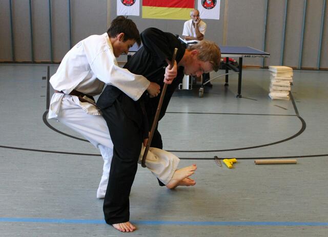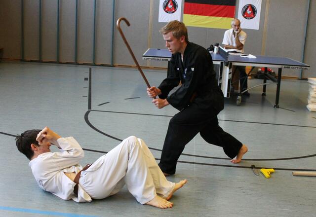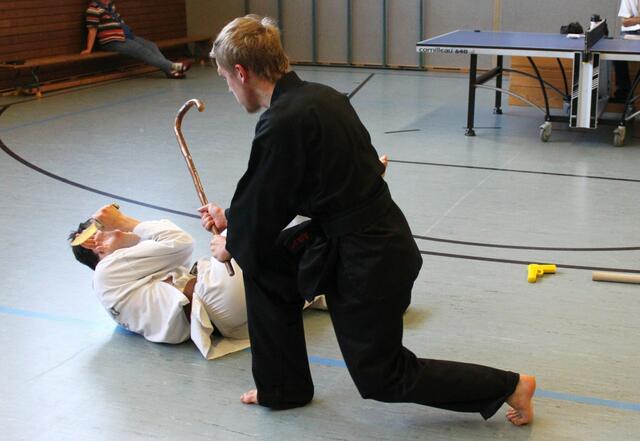 Allkampf-Jitsu Dan-Prüfung mit Regenschirm und Spazierstock