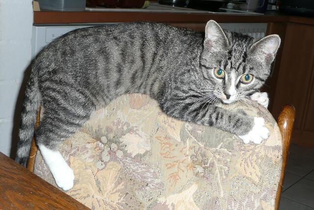 Stühle sind zum Klettern da. Besonders viel Spaß macht es, wenn die Rückenkissen des Stuhls mit abnehmbarem Klettverschluss versehen sind. Also raufgeklettert, in richtige Posistion bringen und dann loslegen. Rückzuck die beiden Klettverschlüsse hinten links und rechts abgemacht und unten ist das Kissen