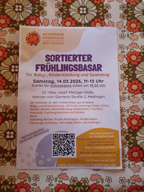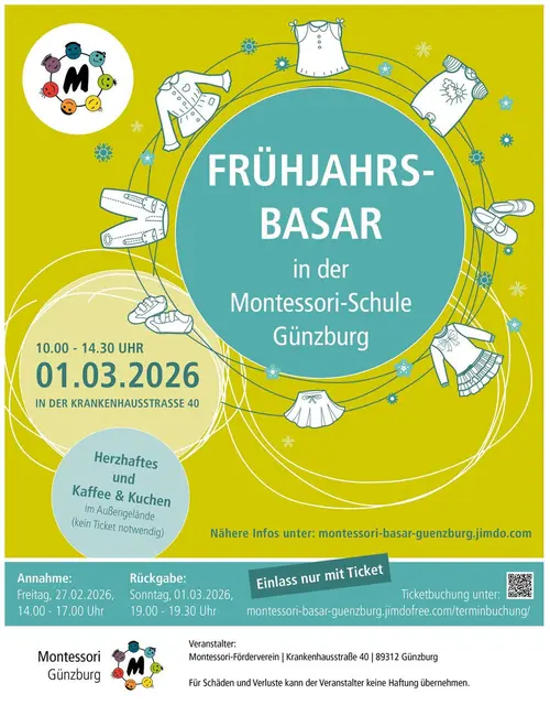Der Montessori Förderverein Günzburg veranstaltet am Sonntag, den 01.03.26 in der Montessori Schule Günzburg, Krankenhausstr. 40 einen Frühjahrs-Basar von 10.00 – 14.30 Uhr. Der Einlass ist nur mit Ticketbuchung unter https://montessori-basar-guenzburg.jimdofree.com/terminbuchung/ möglich. Zudem gibt es Herzhaftes und Kaffee & Kuchen im Außengelände. Eine Mitnahme ist auch möglich und eine Ticketbuchung ist hier nicht notwendig. Nähere Informationen zur Veranstaltung unter:...