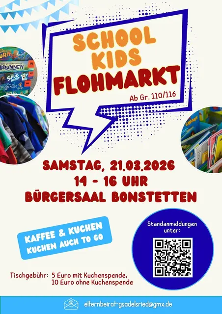 Der Elternbeirat der Grundschule Adelsried lädt herzlich ein zum "school kids"-Flohmarkt! Am Samstag, 21.03.2026 darf von 14-16 Uhr im Bürgersaal Bonstetten fleißig verkauft und gekauft werden. Angeboten werden speziell Artikel für Kinder ab dem Schulalter, also vor allem Kleidung ab Gr. 110/116, Bücher und Spielsachen. Wir freuen uns auf euch!  Kontakt: elternbeirat-gsadelsried@gmx.de