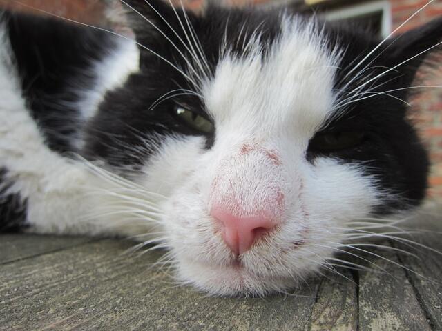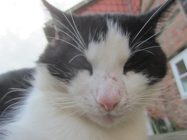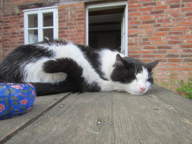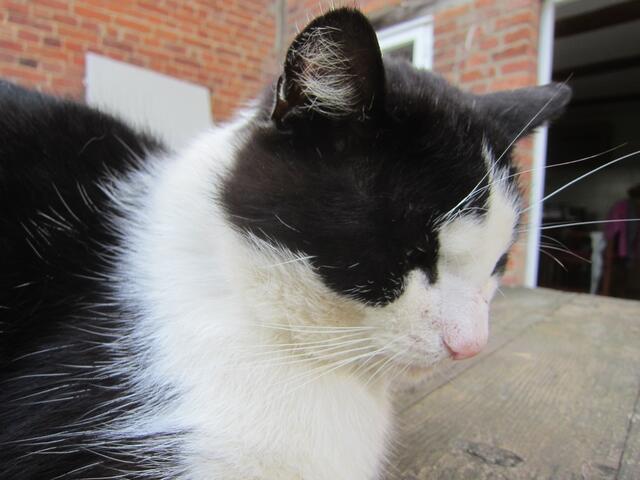 Zwei eigene Katzen und eine sechsköpfige Katzenfamilie auf dem Strohboden sind ja offenbar noch nicht genug - dachte sich Streunerkater Kletto und besuchte uns heute endlich mal wieder. Er ist wohlgenährt und sieht total gesund und gepflegt aus. Auch lässt er sich streicheln und hat nicht - wie manchmal, wenn er lange fort war - diese Anfangsscheu ... :-)