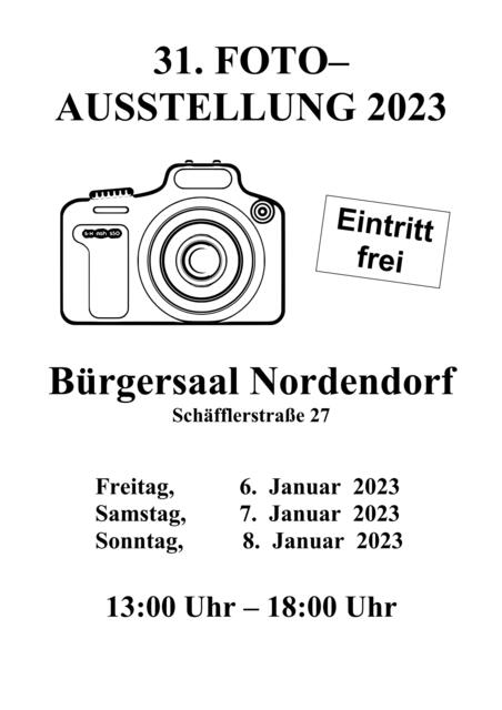 Zur 31. Fotoausstellung laden die Fotofreunde Nordendorf am Heilig-Drei-Königs-Wochenende ein. Über zehn Hobbyfotografen werden über 100 Photos mit den unterschiedlichsten Themen zeigen. Die Ausstellung ist bekannt für ihre bunte Vielfalt und findet von Freitag, den 06.01.23 bis Sonntag, den 08.01.23, jeweils von 13.00-18.00 Uhr , im Bürgersaal Nordendorf (Schäfflerstrasse 27) statt. Der Eintritt ist frei.