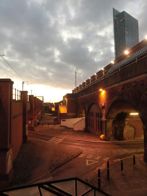 16.30 Manchester alter Industriebahnhof - unterirdisch jetzt großes, teures und somit fast leeres Parkhaus - oberirdisch faszinierende Ausblicke auf moderne und postmoderne Architektur in Harmonie mit viktorianischen Bauten. Die Sonne umspielt mit ihrem rosa Licht den alten Klinker, die spiegelnden Glasfassaden und die schon hell strahlenden nächtliche Lichter.