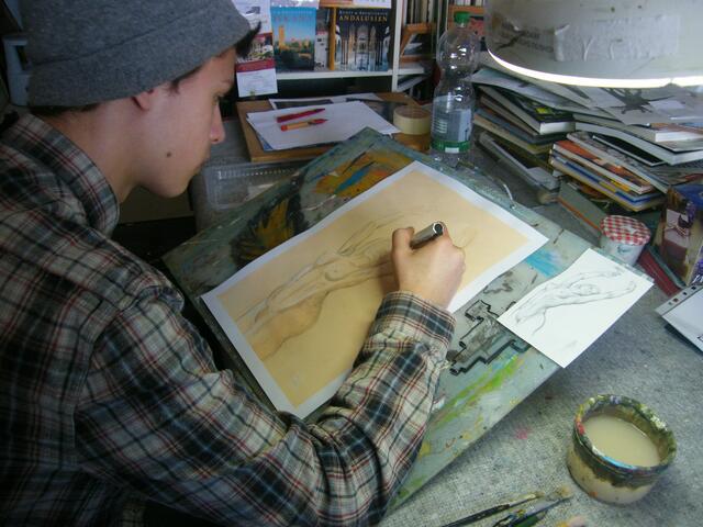 Heute war etwas mehr handwerkliches zum Auftakt. Felix muißte ein Brett von 120x60 cm mit der Kreissäge mittig durchschneiden, dann grundierte er eine Fläche und nahm die zweite Platte um eine Skizze 1 zu 1 von dem Fresko zu machen. Als wir das alles besprochen hatten, warteten wir das die Grundierung an der Sonne trocknete. Die Fläche mußte noch fein abgeschliffen werden. Danach fing er an das Fresko aufzuzeichnen mit Zirkel, Lineal und Wasserwaage. Er konstruierte das Bild richtig und genau....