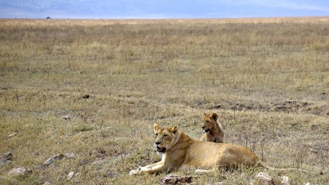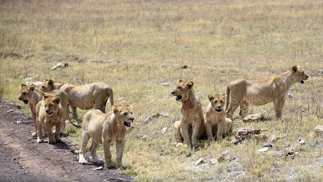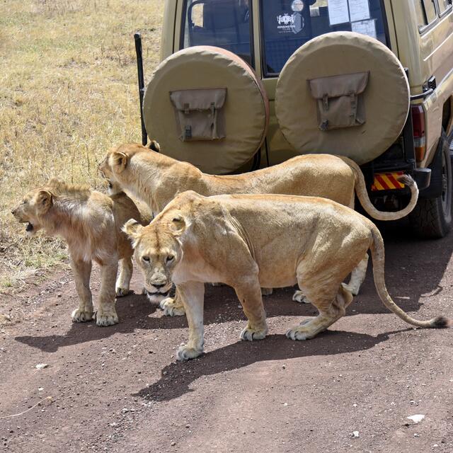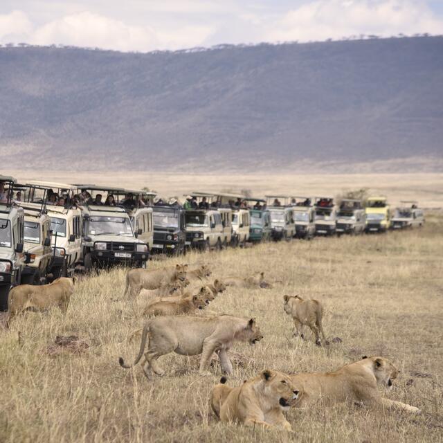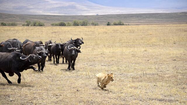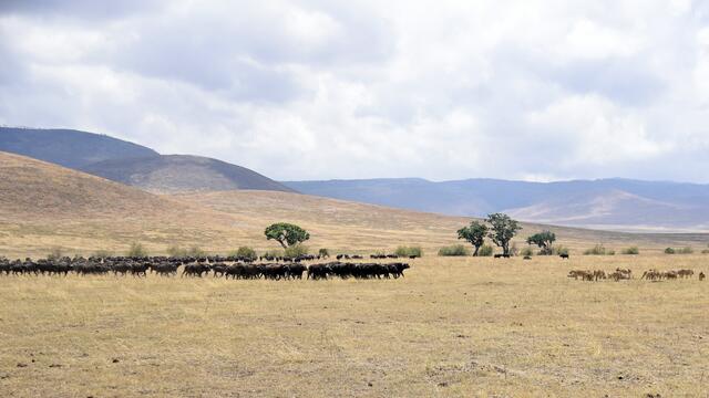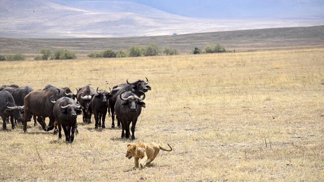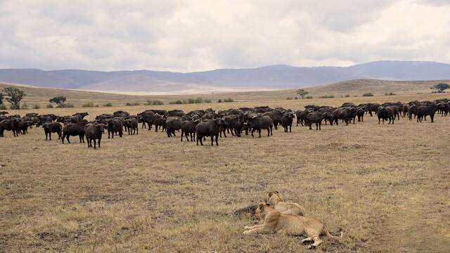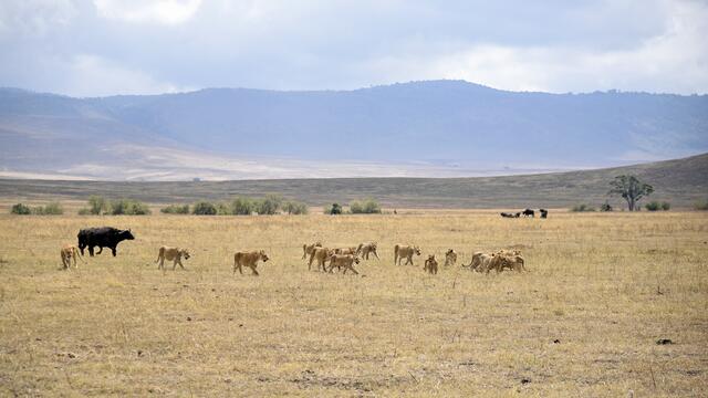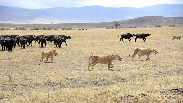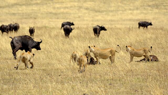 Als wir am Grund des Kraters ankamen, konnten wir schnell viele schöne Tier- und Landschaftsfotos machen. Plötzlich plärrte das Funkgerät unseres Guides und nach einem kurzen Gespräch wurde er aufgeregt und raste in eine andere Richtung los. Nach wenigen Minuten sahen wir eine große Reihe von Safarifahrzeugen am Wegesrand aufgeregt und einigen hundert Meter davon eine riesige Büffelherde. Dazwischen lag ein großes Löwenrudel um ein dunkles Tier herum. Schließlich näherten sich die Büffel den...