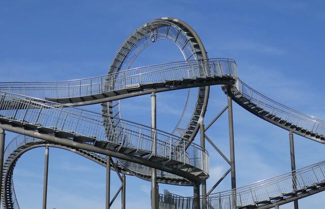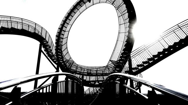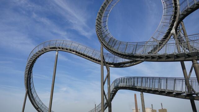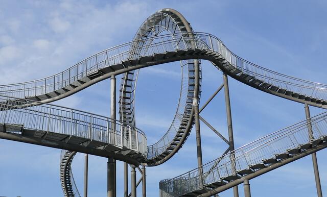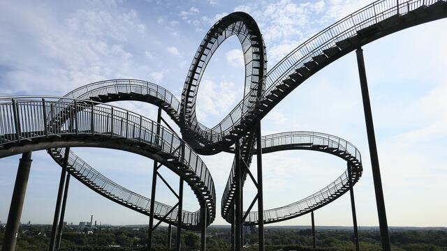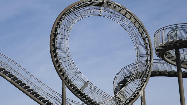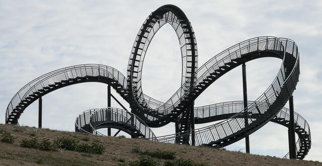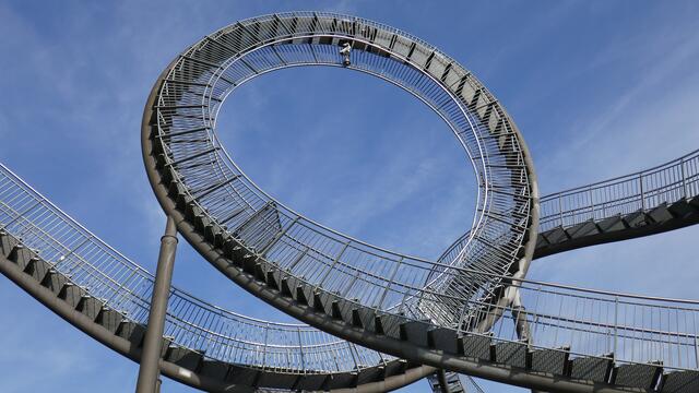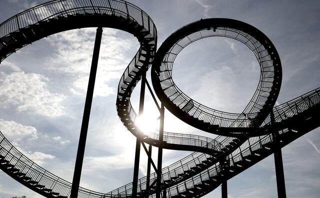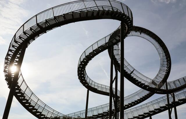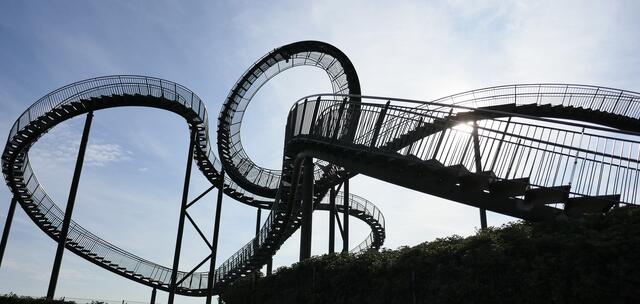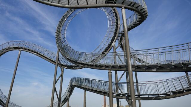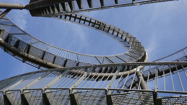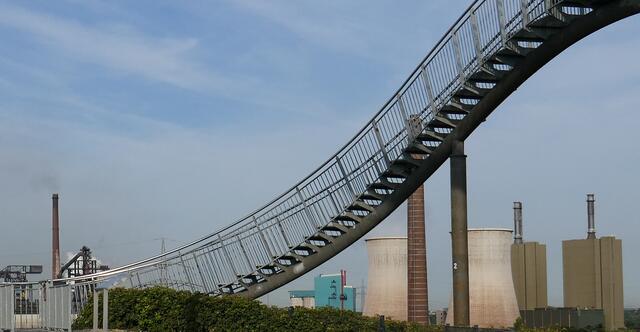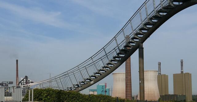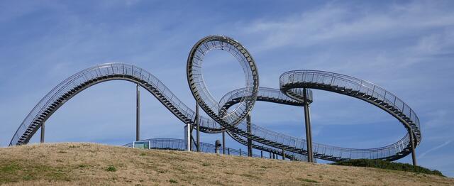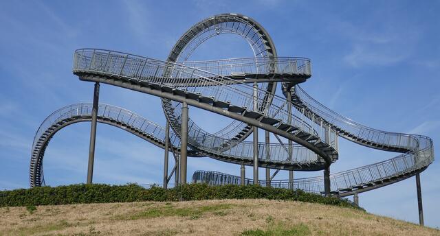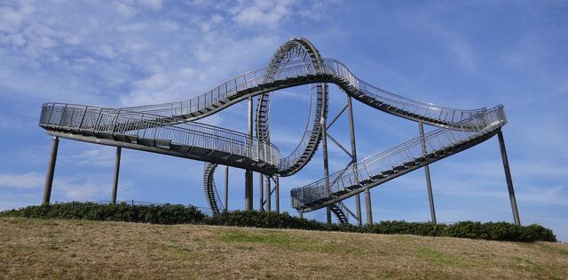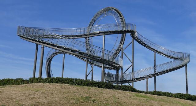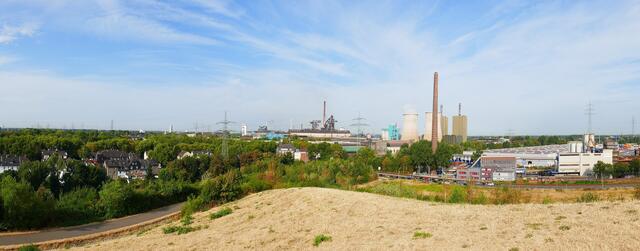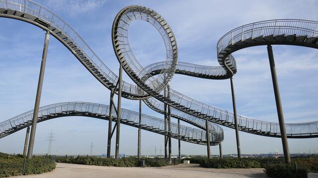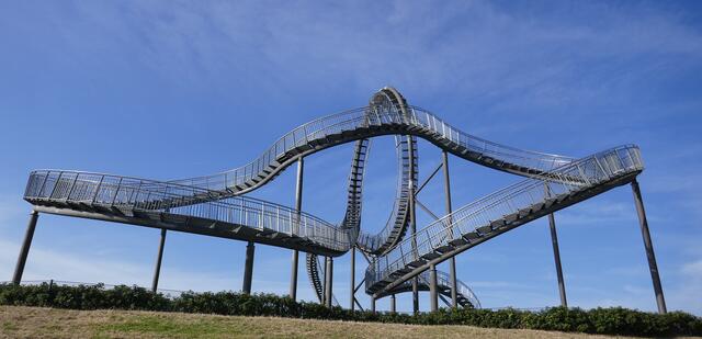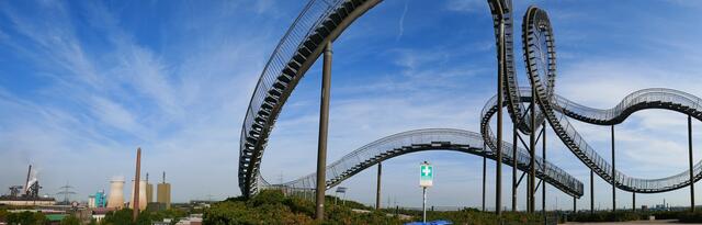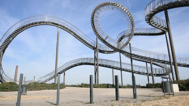 Die weithin sichtbare Landmarke Tiger & Turtle wurde auf einer ehemaligen Halde im Duisburger Süden errichtet. Wer die Stufen bis zum Looping erklimmt, wird mit einer grandiosen Aussicht belohnt. Bei gutem Wetter sieht man von Duisburg-Angerhausen bis nach Krefeld und sogar bis Düsseldorf. Rings um die Skulptur herum blickt man auf das geschäftige Treiben der Hüttenwerke, auf Containerburgen des Logports, aber auch auf dichte naturbelassene Waldgebiete.