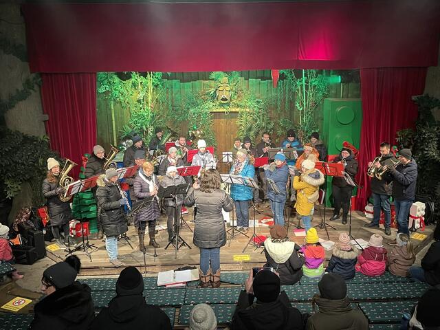 Normalerweise starten die Musikantinnen und Musikanten vom Reisensburger Musikverein erst gegen März/April mit ihren öffentlichen „Spielereien“. Auf Einladung von Legoland in Günzburg spielten sie jedoch schon am 4. Januar beim WinterWonderLegoland auf der Bühne im „Affentheater“ und präsentierten sich im weihnachtlich geschmückten Park! Foto: Wolfgang Hödl