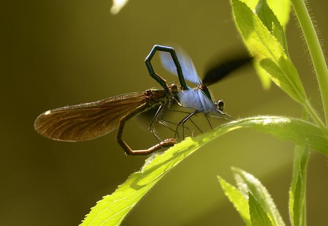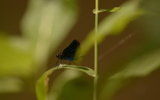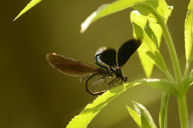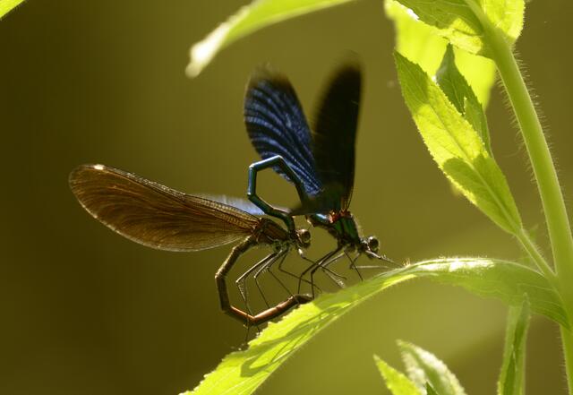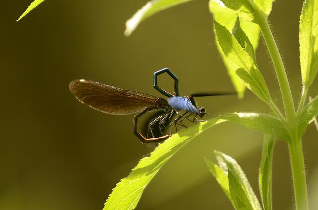 Moderne Solartechnik: Vorgeführt von einem Männchen der Gebänderten Prachtlibelle (Calopteryx splendens)